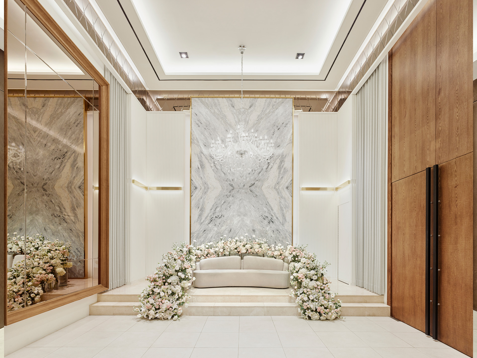 신부대기실 입구에서부터 퍼지는 향기로운 꽃향기와 높은 천고에서 보여지는 웅장함, 고급스럽지만 과하지 않은 장식들로 하여금 신부님의 품격을 높여 드립니다.