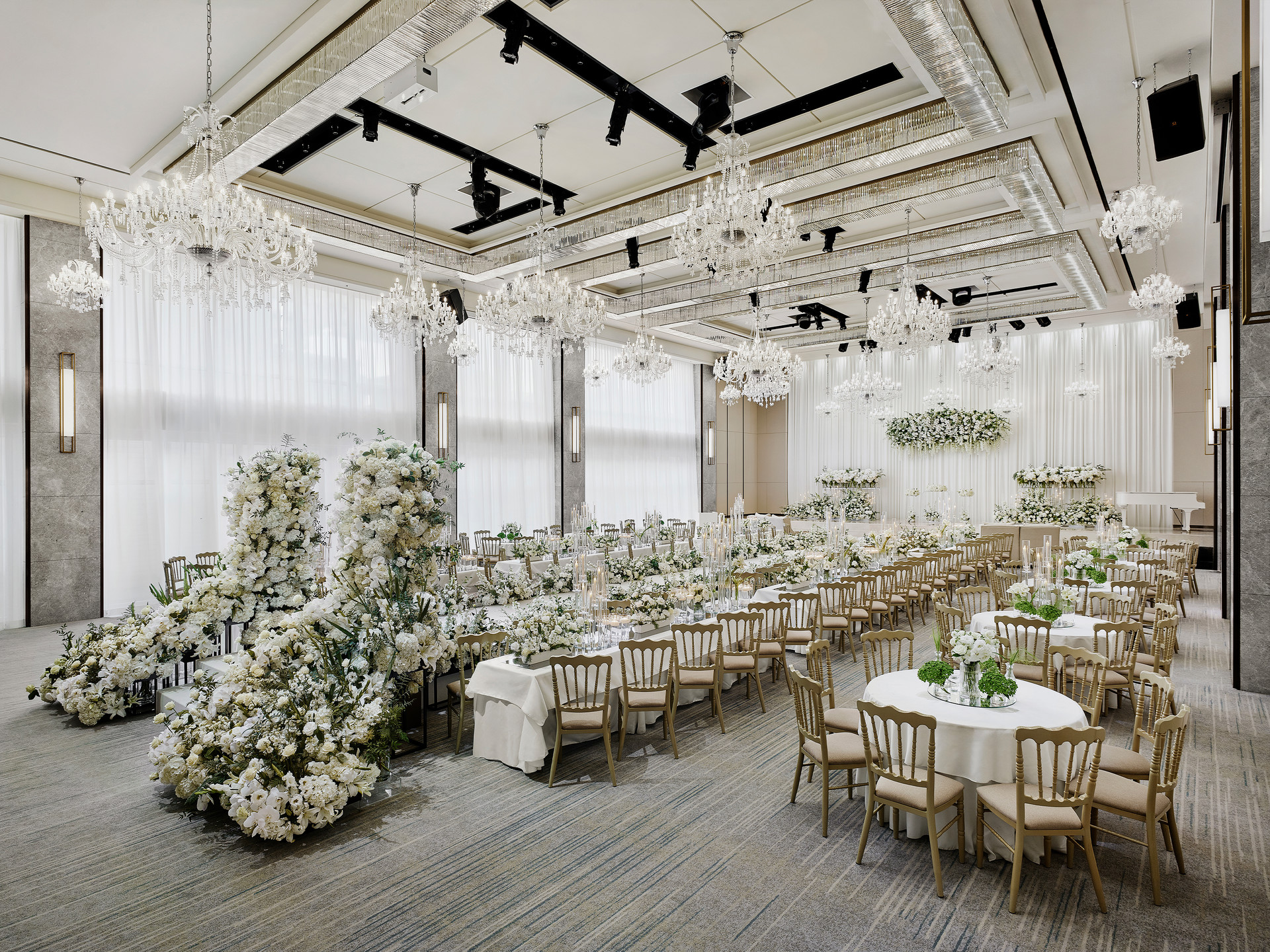 공간을 가득 채우는 고급스러운 샹들리에와 은은한 조명은 햇살과 어우러져 밝고 품격 있는 분위기를 연출하며, 세련된 인테리어와 여유로운 공간감의 단독홀에서 호텔 감성의 모던하고 우아한 웨딩을 완성합니다.